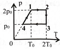 Có 1 g khí Helium coi là khí lí tưởng, khối lượng mol là 4 g/mol, thực hiện một chu trình 1 – 2 – 3 – 4 – 1 được biểu diễn trên đồ thị p − T như hình vẽ. Cho p0 = 105 Pa, T0= 300 K.